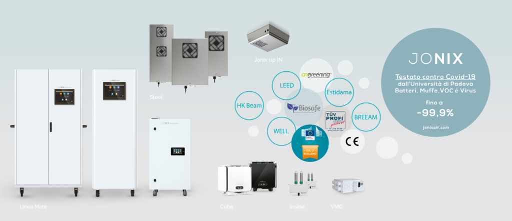 La sanitizzazione dell’aria degli spazi indoor sia per uso domestico che professionale, attraverso dispositivi certificati, sicuri, testati: questo è il nostro lavoro da anni in Jonix. La nostra esperienza si è sviluppata in linee di prodotti diversi per ambito d’uso, potenza e applicazione: Cube, Steel, Mate e Inside sono le linee di prodotti tra cui scegliere  in base all’utilizzo, alle dimensioni dello spazio e dell’attività…